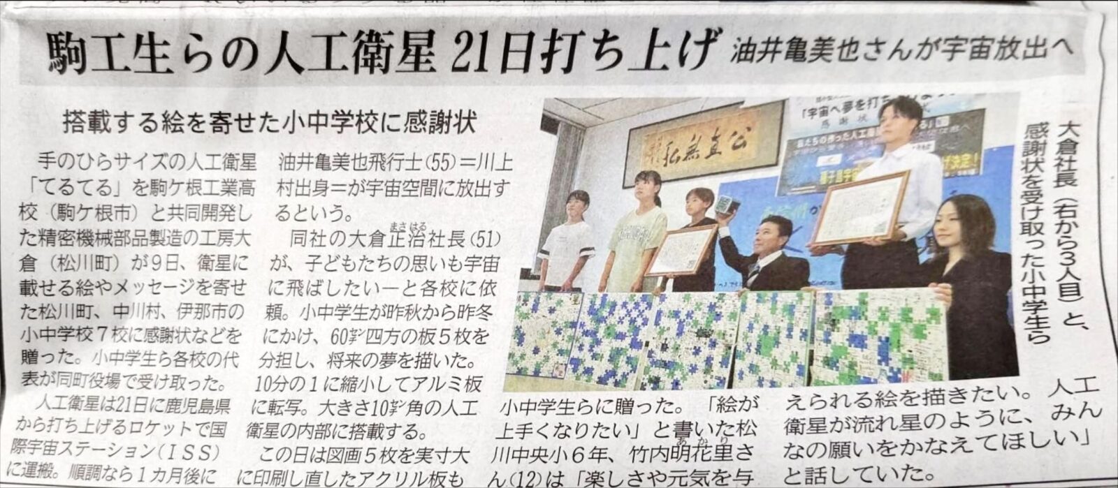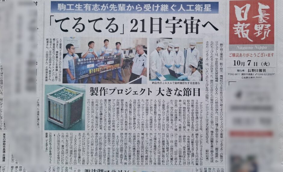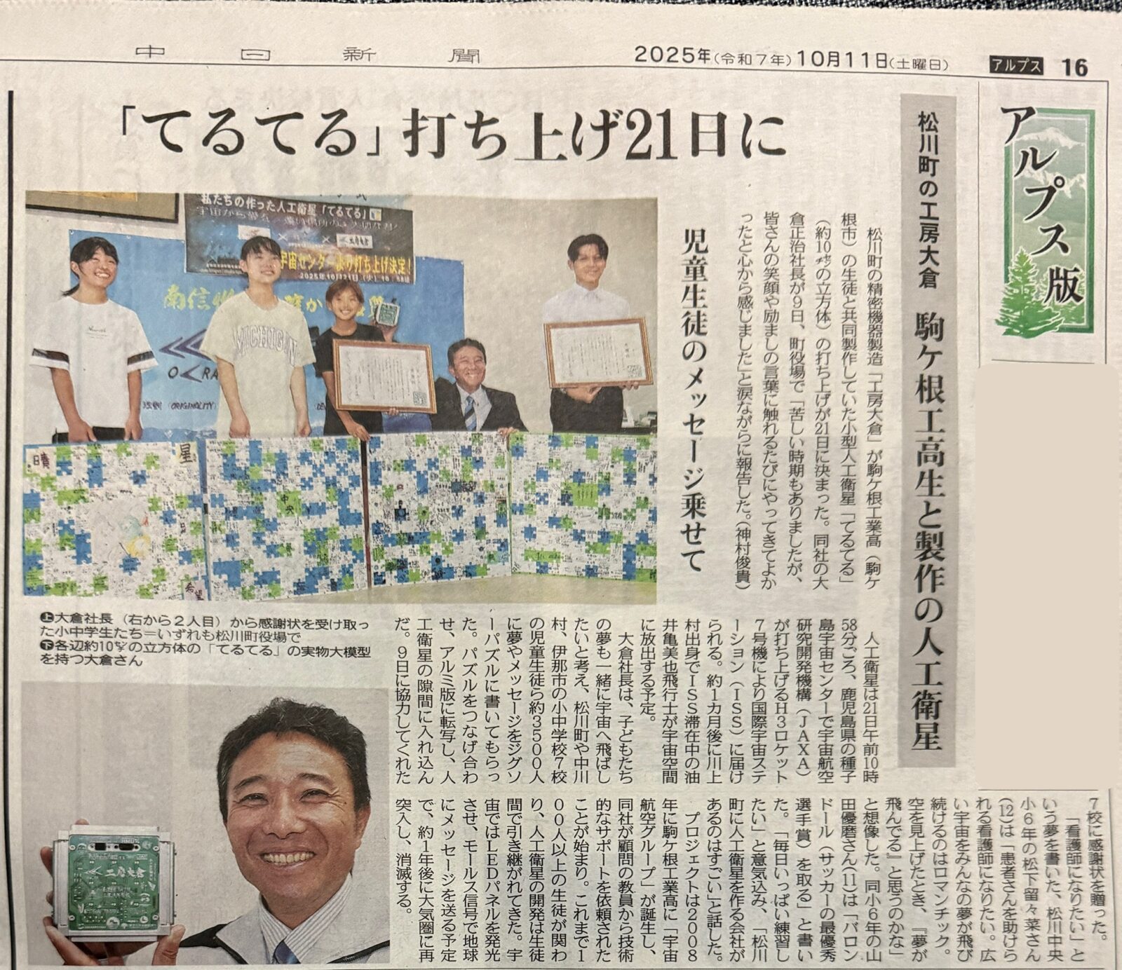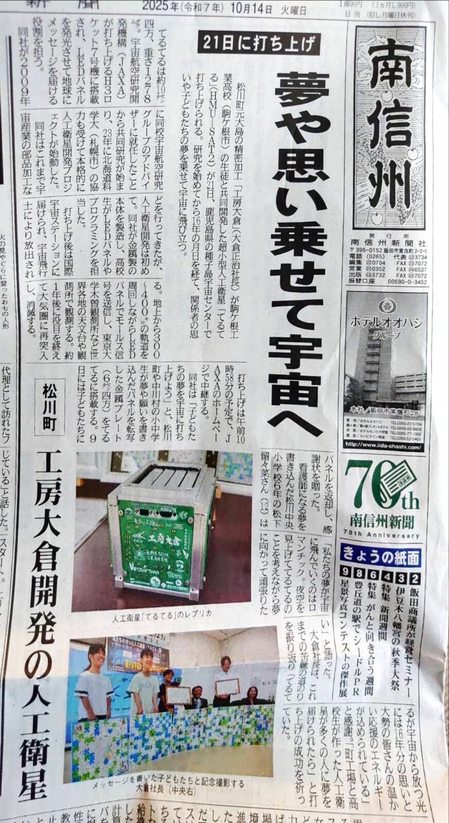 ホーム広報室人工衛星プロジェクト メディアに取り上げていただきました 2025年10月14日2025年10月15日 信濃毎日新聞 2025年10月10日 中日新聞 2025年10月11日 南信州新聞 2025年10月14日